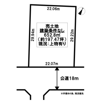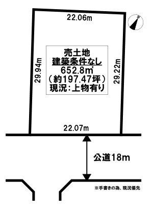 | 現況 | 建物付き(更地渡し可能)(現況上物有ですが、更地でのお引渡しとなります。) |