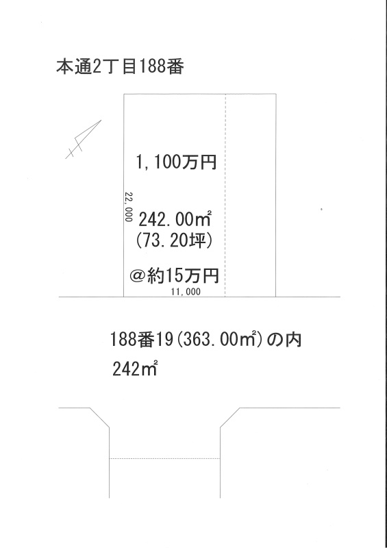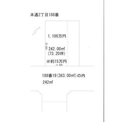 ここに注目!本通2丁目に73.20坪の売地が出ました。分筆前につき多少の増減あります。まずはお問合せ下さい。