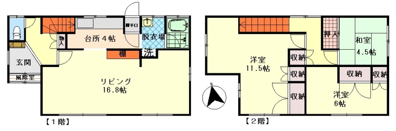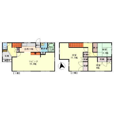 | 間取り | 3LDK1階:L16.8帖 K4帖 / 2階:洋室11.5帖 洋室6帖 和室4.5帖 |
