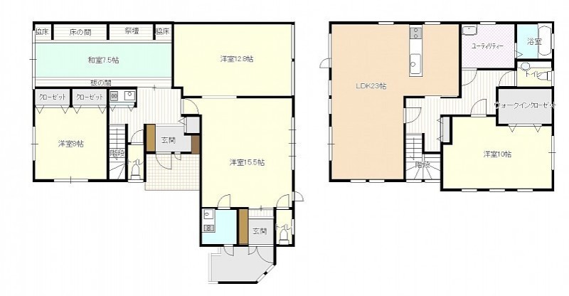 | 間取り | その他1階:LDK15帖 洋室12帖 洋室8帖 和室7.5帖 / 2階:LDK23帖 洋室10帖 |