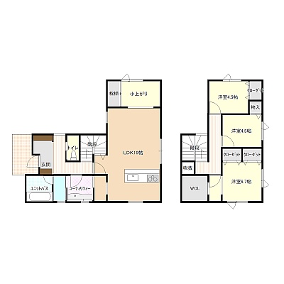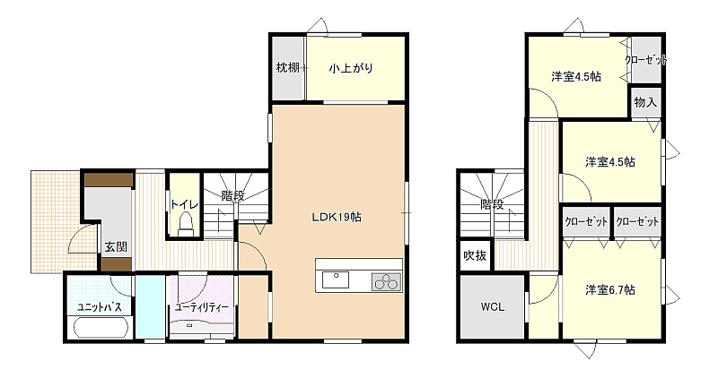 建物の階建 地上2階建 構造 木造 間取り 3LDK1階:LDK19帖 その他 / 2階:洋室6.7帖 洋室4.5帖 洋室4.5帖 駐車場 あり接道状況 一方 - 北側幅10.90mの公道に接道