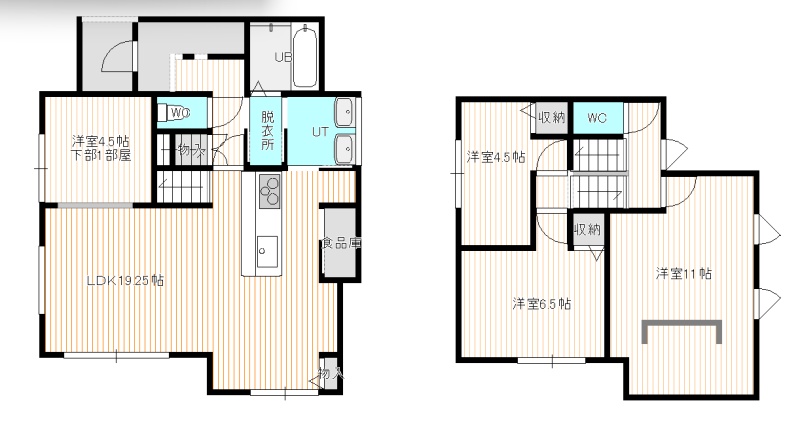 | 間取り | 4LDK1階:洋室4.5帖 LDK19.25帖 / 2階:洋室4.5帖 洋室6.5帖 洋室11帖 |