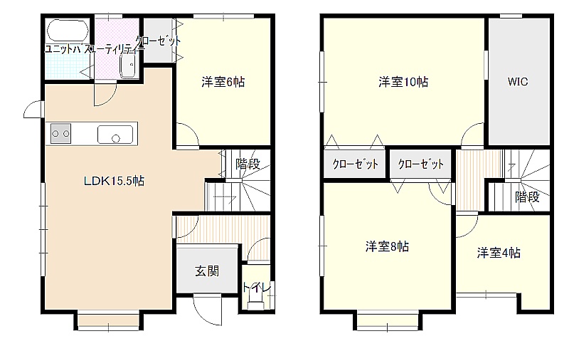 | 間取り | 4LDK1階:LDK15.5帖 / 2階:洋室6帖 洋室10帖 洋室8帖 |
