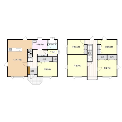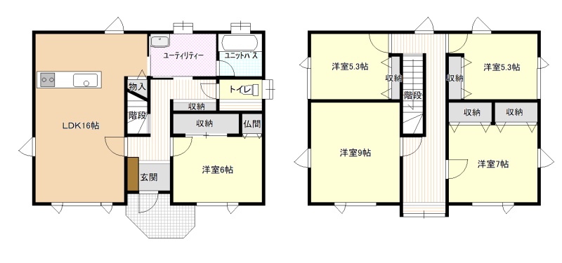 | 間取り | 5LDK1階:LDK16帖 洋室6帖 / 2階:洋室9帖 洋室7帖 洋室5.3帖 洋室5.3帖 |