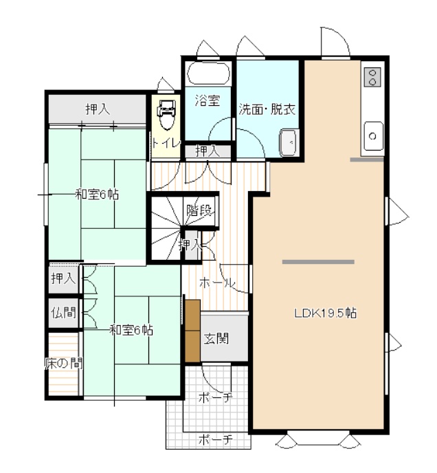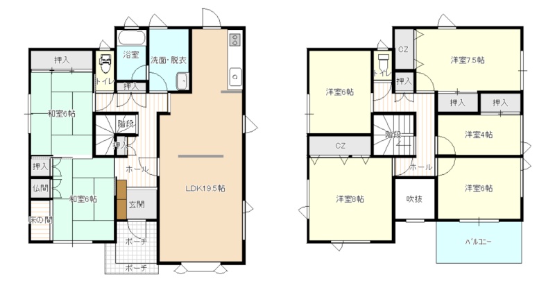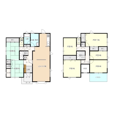 | 間取り | 7DK以上1階:LDK19.5帖 和室6帖 和室6帖 / 2階:洋室6帖 洋室4帖 洋室7.5帖 洋室6帖 洋室8帖 |