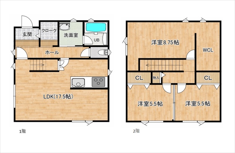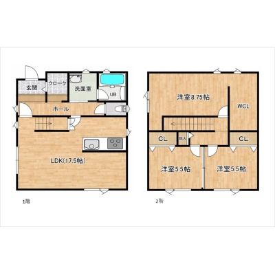 | 間取り | 3LDK1階:LDK17.5帖 / 2階:洋室8.75帖 洋室5.5帖 洋室5.5帖 |