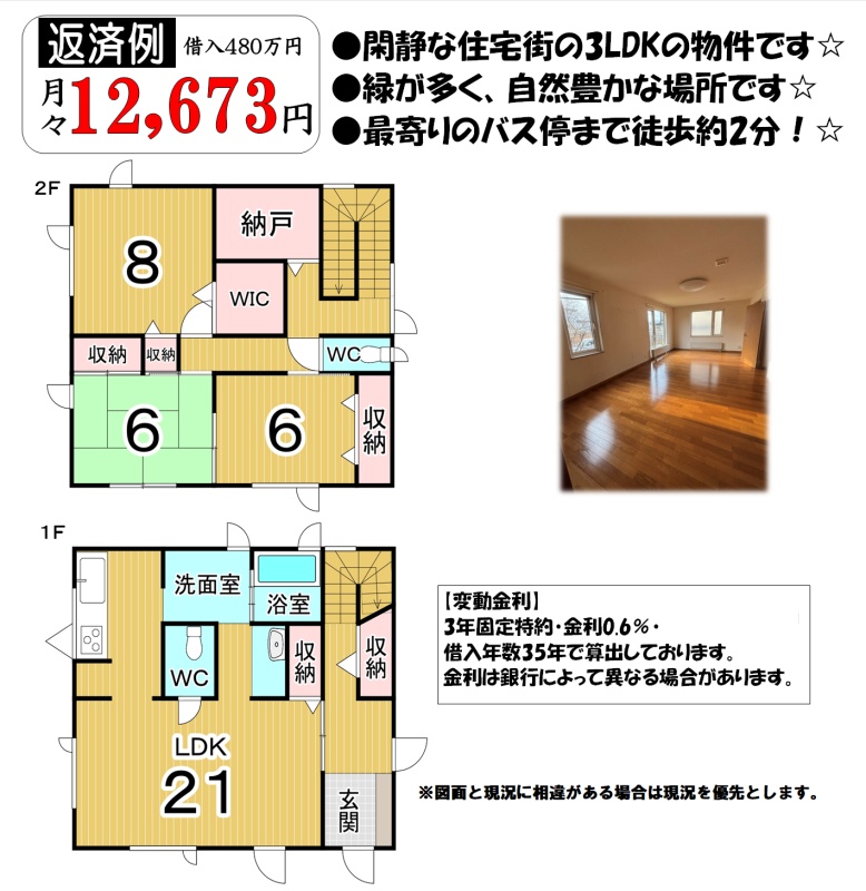 ここに注目!●閑静な住宅街にある3LDKの物件です☆●緑が多く、自然豊かな場所です☆●最寄りのバス停まで徒歩約2分!☆●函館西旭岡郵便局まで徒歩約12分(距離約929m)☆●コープさっぽろ旭岡店まで徒歩約14分(距離約1046m)☆●セイコーマート函館西旭岡まで徒歩約23分(距離約1799m)☆※返済例は【変動金利】3年固定特約・金利0.6%・借入年数35年で算出しております。金利は銀行によって異なる場合があります。 お問い合わせは、ハウスドゥ!ベイエリア店へお気軽にご連絡ください(^^♪