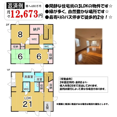 | 間取り | 3LDK1階:LDK21帖 / 2階:洋室8帖 和室6帖 洋室6帖 |