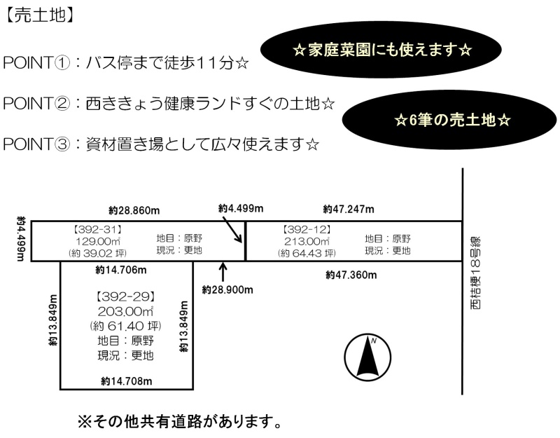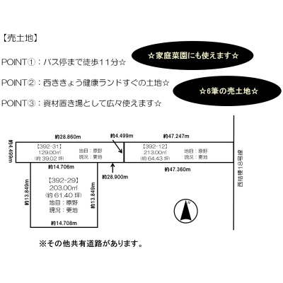 備考 ※市街化調整区域の為、建築不可 ※宅地造成等工事規制区域 ※6筆(392-29、392-31、392-12、392-25、392-43、392-1) ※設備・間取については、現状優先とさせていただきます。 学区色がついているアイコンをクリックすると、本物件までの道順を見ることができます。