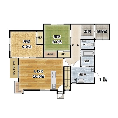 | 間取り | 4LDK1階:LDK16.2帖 洋室9帖 和室8帖 / 2階:洋室11帖 洋室7帖 |