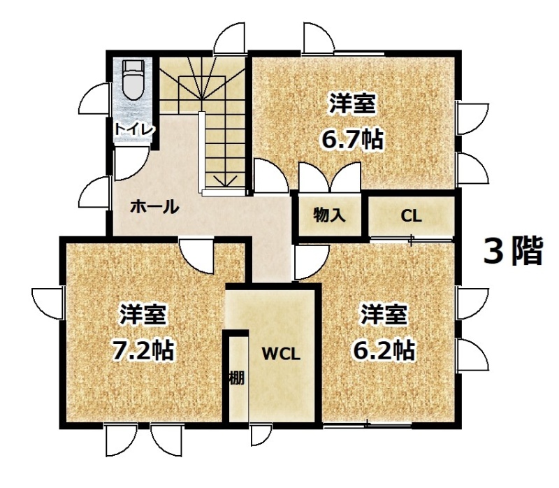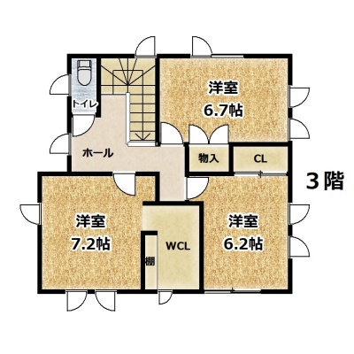 | 間取り | 4LDK1階:和室6帖 / 2階:LDK20帖 / 3階:洋室7.2帖 洋室6.7帖 洋室6.2帖 |