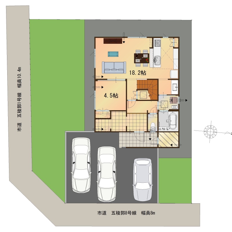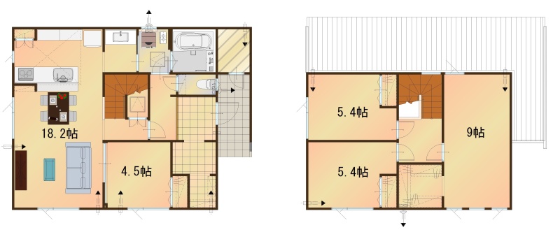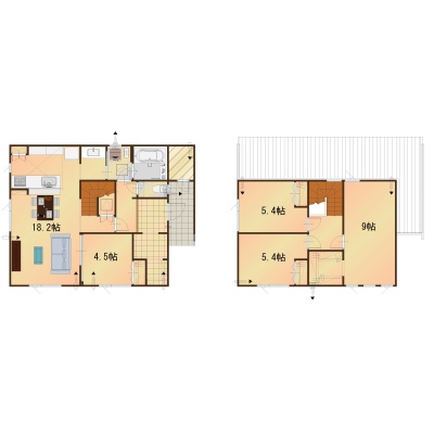 | 間取り | 4LDK└ 1階:LDK18.2帖 洋室4.5帖 / 2階:洋室9帖 洋室5.4帖 洋室5.4帖 |
