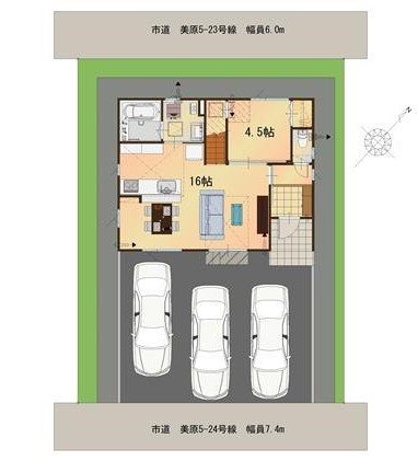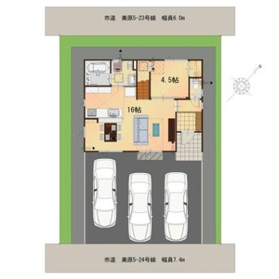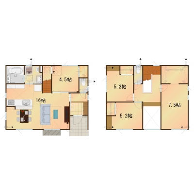 | 間取り | 4LDK1階:LDK16帖 洋室4.5帖 / 2階:洋室7.5帖 洋室5.2帖 洋室5.2帖 |