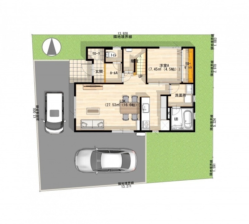 物件正面に並列1台、物件向かって右に縦列1台 |
