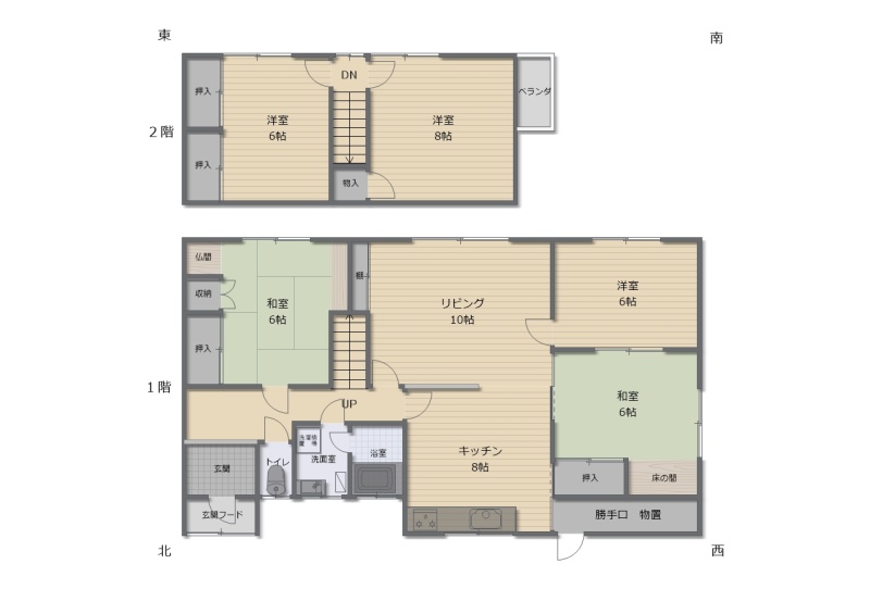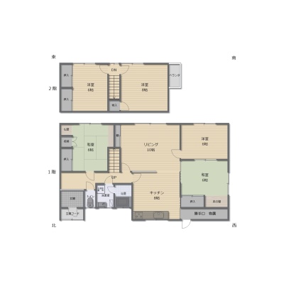 | 間取り | 5LDK1階:L10帖 K8帖 洋室6帖 和室6帖 和室6帖 / 2階:洋室8帖 洋室6帖 |