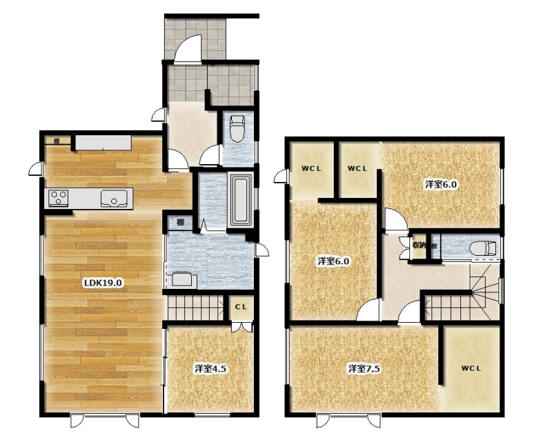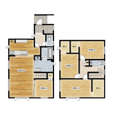 | 間取り | 4LDK1階:LDK19帖 洋室4.5帖 / 2階:洋室6帖 洋室6帖 洋室7.5帖 |