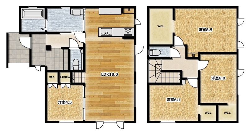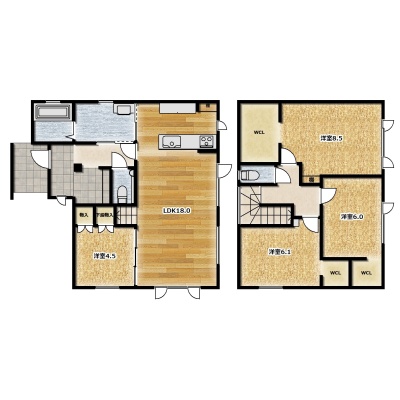 | 間取り | 4LDK1階:LDK18帖 洋室4.5帖 / 2階:洋室6帖 洋室6.1帖 洋室8.5帖 |