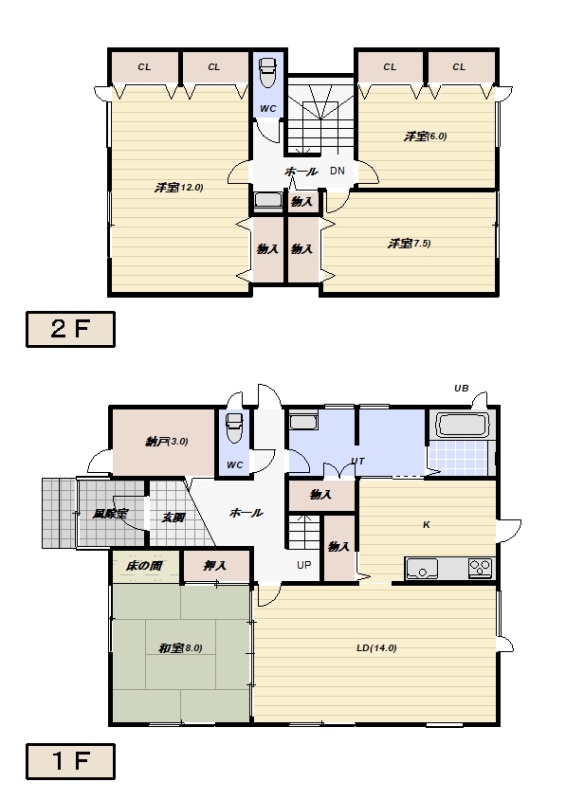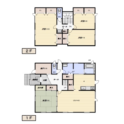 | 間取り | 4LDK1階:LD14帖 K 和室8帖 / 2階:洋室12帖 洋室7.5帖 洋室6帖 |