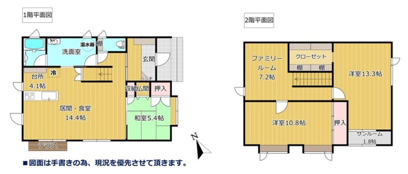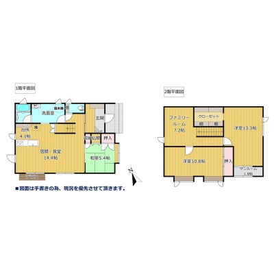 | 間取り | 3SLDK1階:LD14.4帖 K4.1帖 和室5.4帖 / 2階:洋室10.8帖 洋室13.3帖 その他7.2帖 |