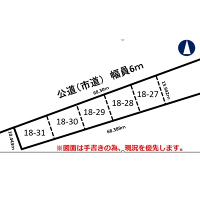 備考 市道側(北側)間口 68.30m 南側 68.389m 学区色がついているアイコンをクリックすると、本物件までの道順を見ることができます。
