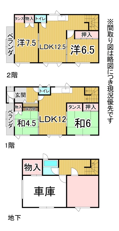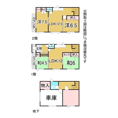 | 間取り | 4LDK1階:LDK12帖 和室6帖 和室4.5帖 / 2階:LDK12.5帖 洋室7.5帖 洋室6.5帖 |