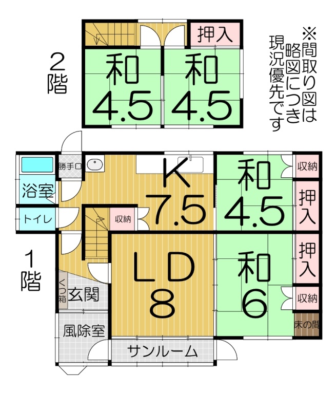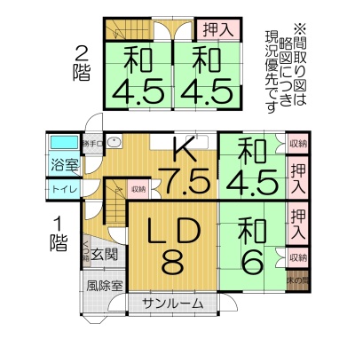 | 間取り | 4LDK1階:LD8帖 K7.5帖 和室4.5帖 和室6帖 / 2階:和室4.5帖 和室4.5帖 |