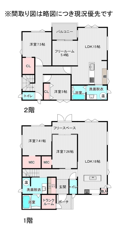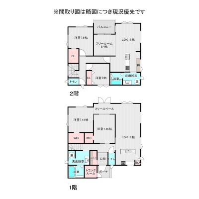 | 間取り | 二世帯型1階:LDK18帖 洋室7.26帖 洋室7.41帖 / 2階:LDK15帖 その他5.4帖 洋室7.5帖 洋室5帖 |