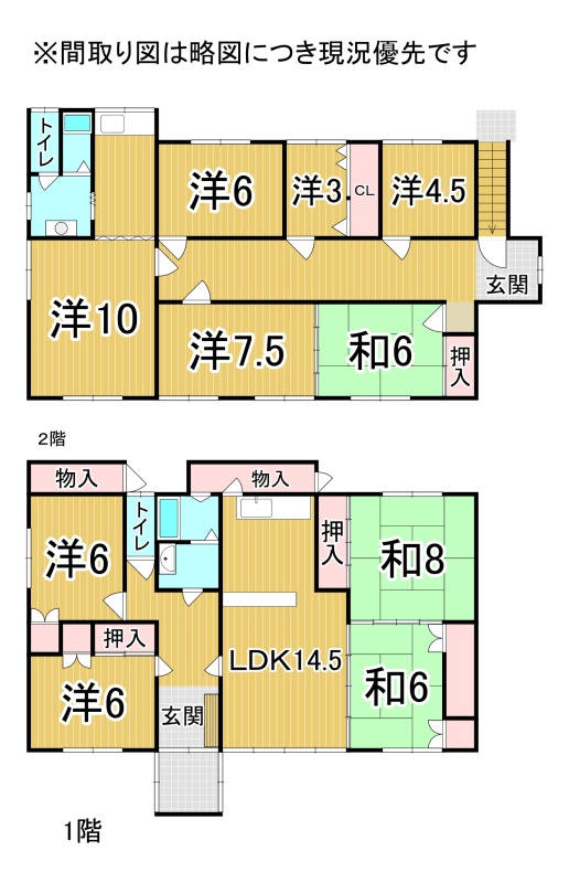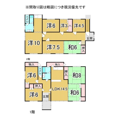 | 間取り | 二世帯型1階:LDK14.5帖 和室8帖 和室6帖 洋室6帖 洋室6帖 / 2階:洋室10帖 洋室7.5帖 洋室6帖 洋室4.5帖 和室6帖 |