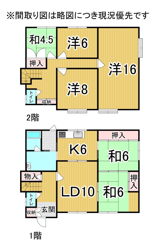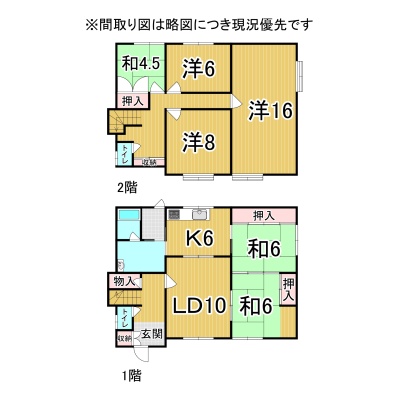 | 間取り | 6LDK1階:LD10帖 K6帖 和室6帖 和室6帖 / 2階:洋室16帖 洋室8帖 洋室6帖 和室4.5帖 |