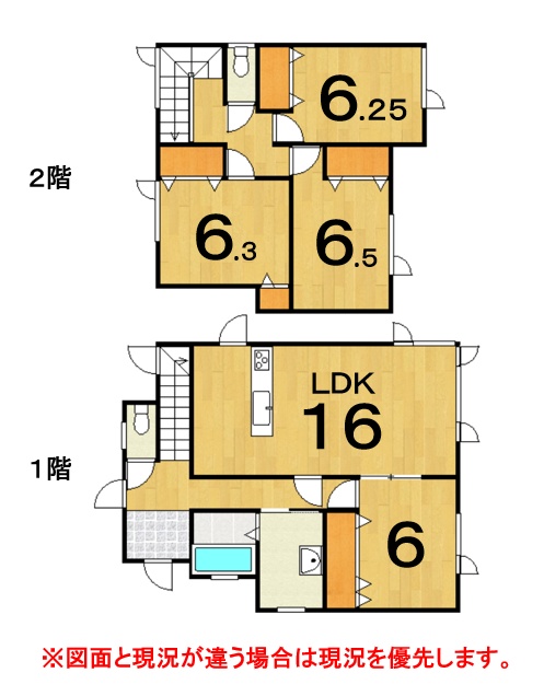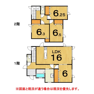 | 間取り | 4LDK1階:LDK16帖 洋室6帖 / 2階:洋室6.5帖 洋室6.3帖 洋室6帖 |