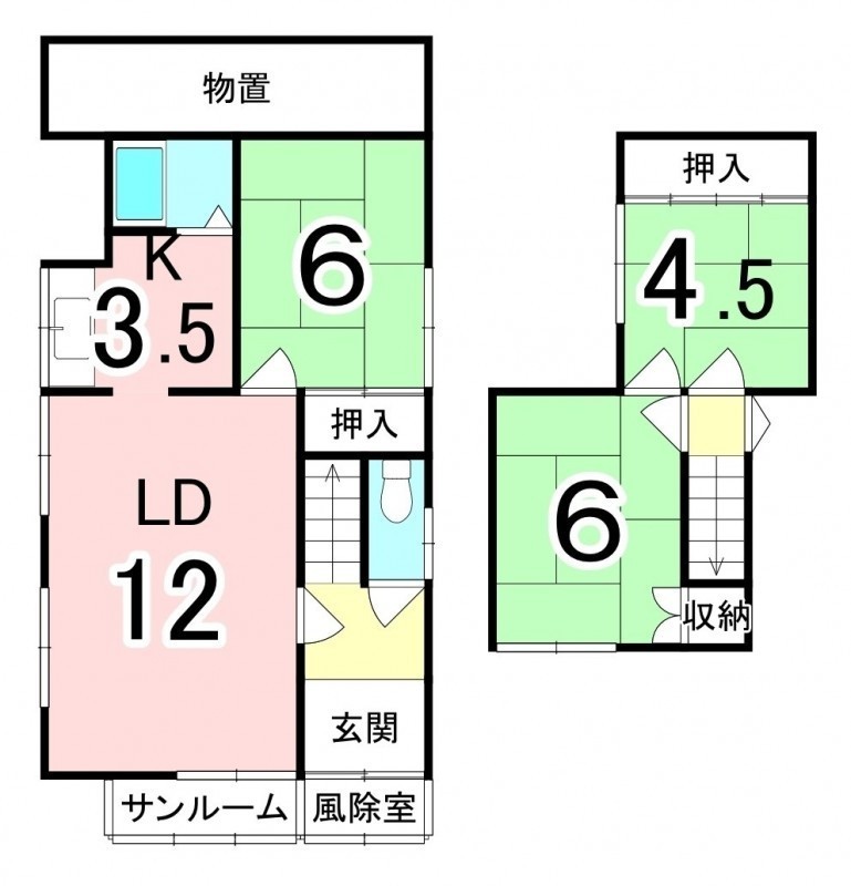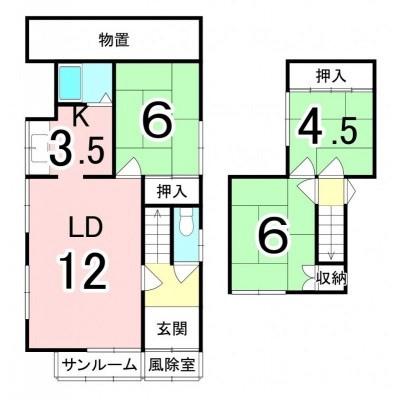 | 間取り | 3LDK1階:LD12帖 K3.5帖 和室6帖 / 2階:和室6帖 和室4.5帖 |