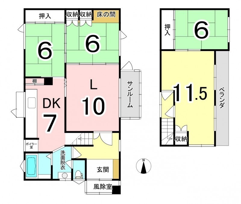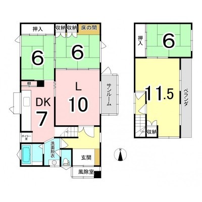 | 間取り | 4LDK1階:L10帖 DK7帖 和室6帖 和室6帖 / 2階:洋室11.5帖 和室6帖 |