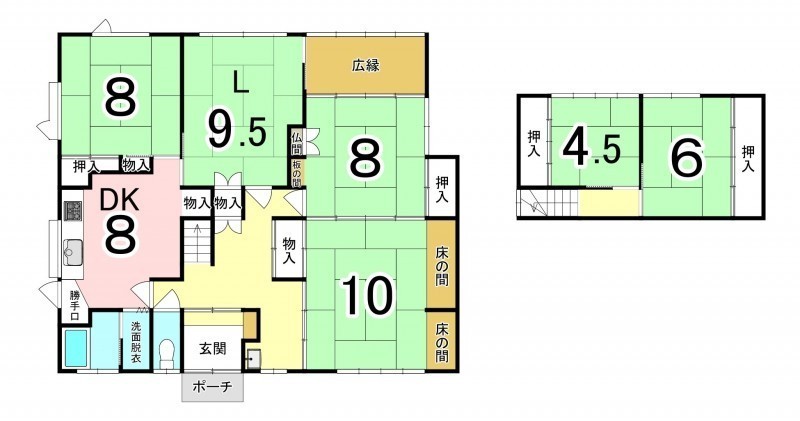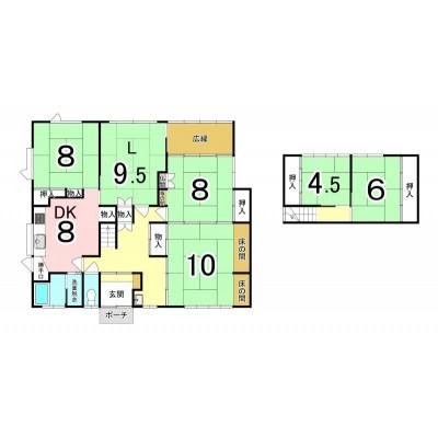 | 間取り | 5LDK1階:和室8帖 L9.5帖 和室8帖 和室10帖 DK8帖 / 2階:和室4.5帖 和室6帖 |