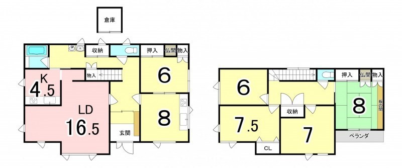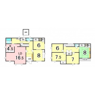 | 間取り | 5LDK1階:LD16.5帖 K4.5帖 和室6帖 DK8帖 / 2階:洋室6帖 洋室7.5帖 洋室7帖 和室8帖 |