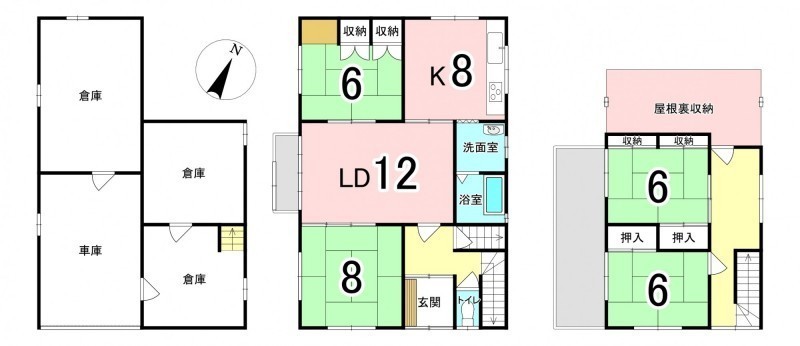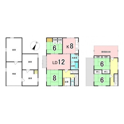 | 間取り | 4SLDK2階:LD12帖 和室6帖 和室8帖 / 3階:和室6帖 和室6帖 S8帖 |