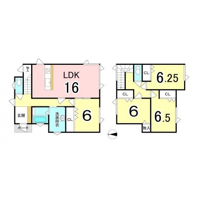 | 間取り | 4LDK1階:LDK16帖 洋室6帖 洋室6帖 / 2階:洋室6.3帖 洋室6.5帖 |