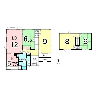 | 間取り | 4LDK1階:LD12帖 和室6.5帖 洋室9帖 K5.7帖 / 2階:和室6帖 洋室8帖 |