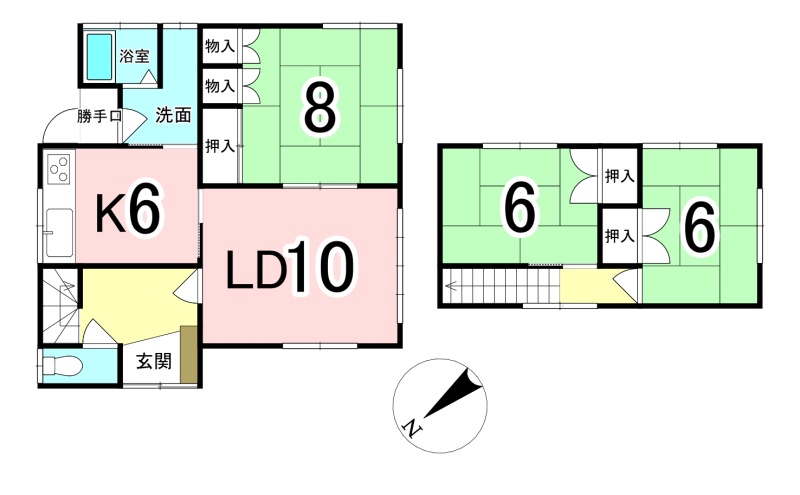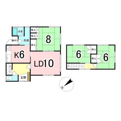 | 間取り | 3LDK1階:LD10帖 K6帖 和室8帖 / 2階:和室6帖 和室6帖 |