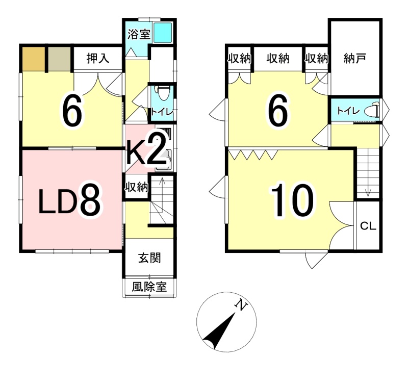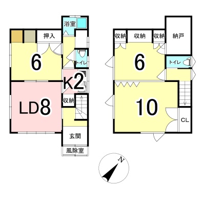 | 間取り | 3LDK1階:LD8帖 K2帖 洋室6帖 / 2階:洋室10帖 洋室6帖 |