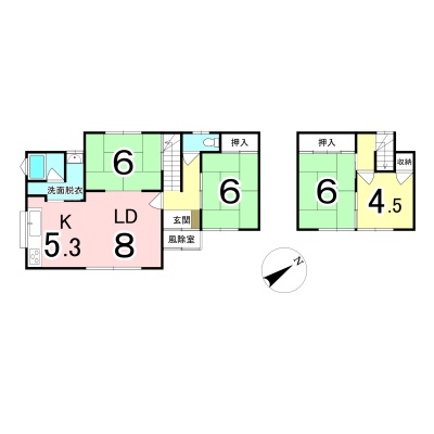 | 間取り | 4LDK1階:LD8帖 K5.3帖 和室6帖 和室6帖 / 2階:和室6帖 洋室4.5帖 |