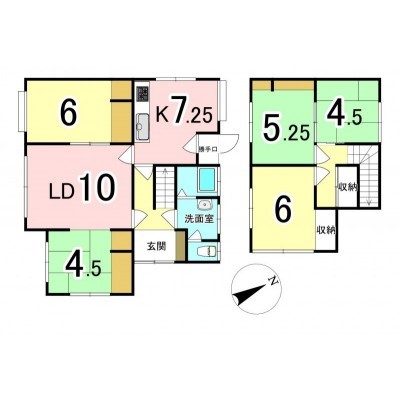 | 間取り | 5LDK1階:LD10帖 K7.25帖 和室4.5帖 洋室6帖 / 2階:和室4.5帖 洋室5.25帖 洋室6帖 |