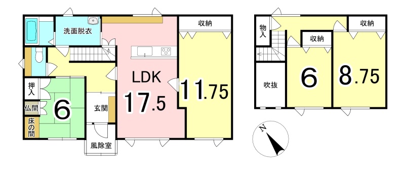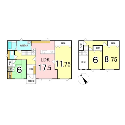 | 間取り | 4LDK1階:LDK17.5帖 洋室11.75帖 和室6帖 / 2階:洋室6帖 洋室8.75帖 |