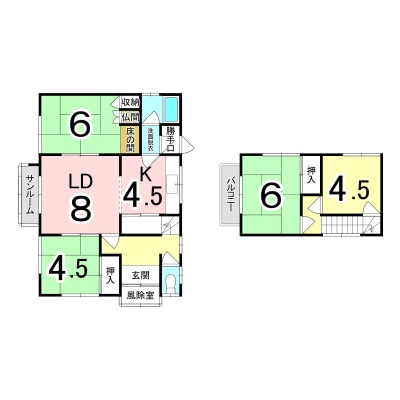 | 間取り | 4LDK1階:LD8帖 K4.5帖 和室6帖 和室4.5帖 / 2階:和室6帖 洋室4.5帖 |