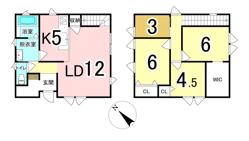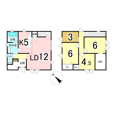 | 間取り | 4LDK1階:LD12帖 K5帖 / 2階:洋室6帖 洋室6帖 洋室4.5帖 洋室3帖 |