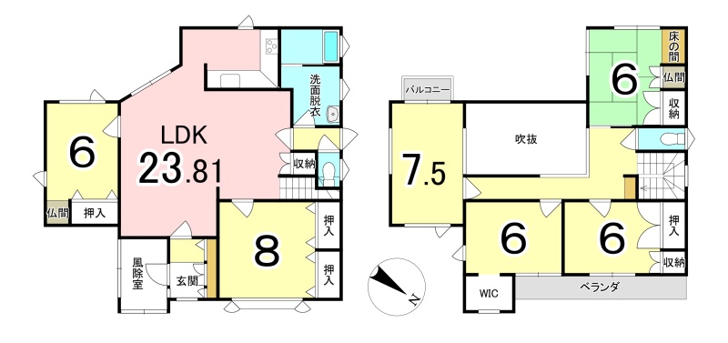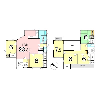 | 間取り | 6LDK1階:LDK23.8帖 洋室6帖 洋室8帖 / 2階:洋室7.5帖 和室6帖 洋室6帖 洋室6帖 |