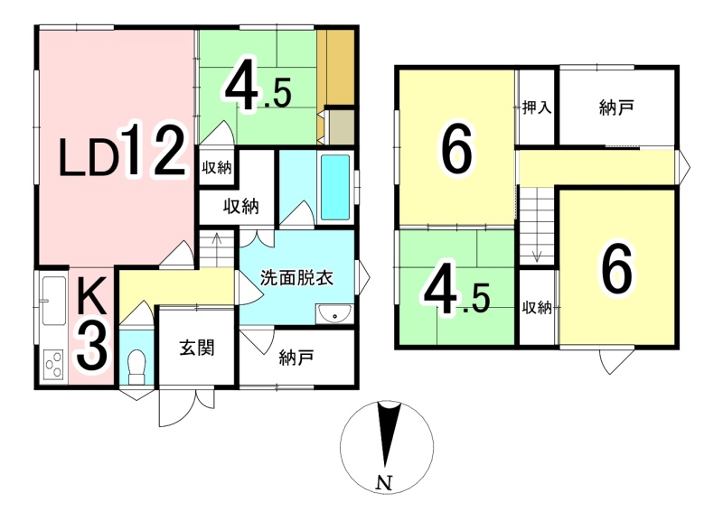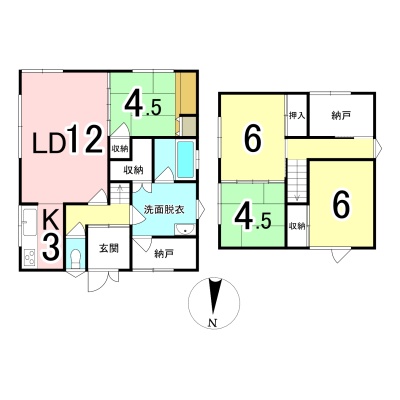 | 間取り | 4LDK1階:LD12帖 K3帖 和室4.5帖 / 2階:和室4.5帖 洋室6帖 洋室6帖 |