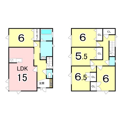 | 間取り | 5LDK1階:LDK15帖 洋室6帖 / 2階:洋室6.5帖 洋室6帖 洋室6帖 洋室5.5帖 |