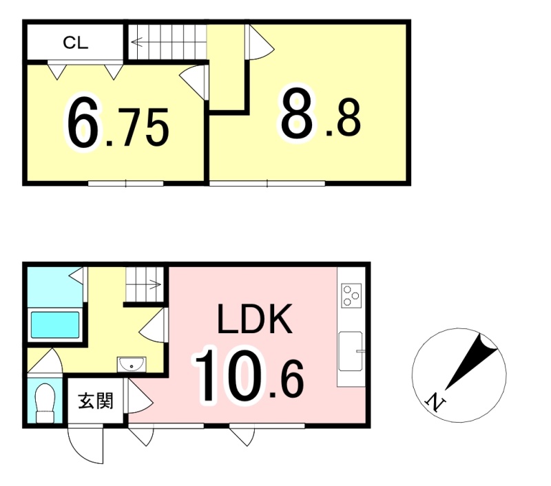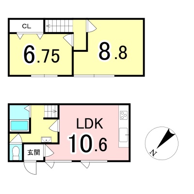 | 間取り | 2LDK1階:LDK10.6帖 / 2階:洋室6.7帖 洋室8.8帖 |