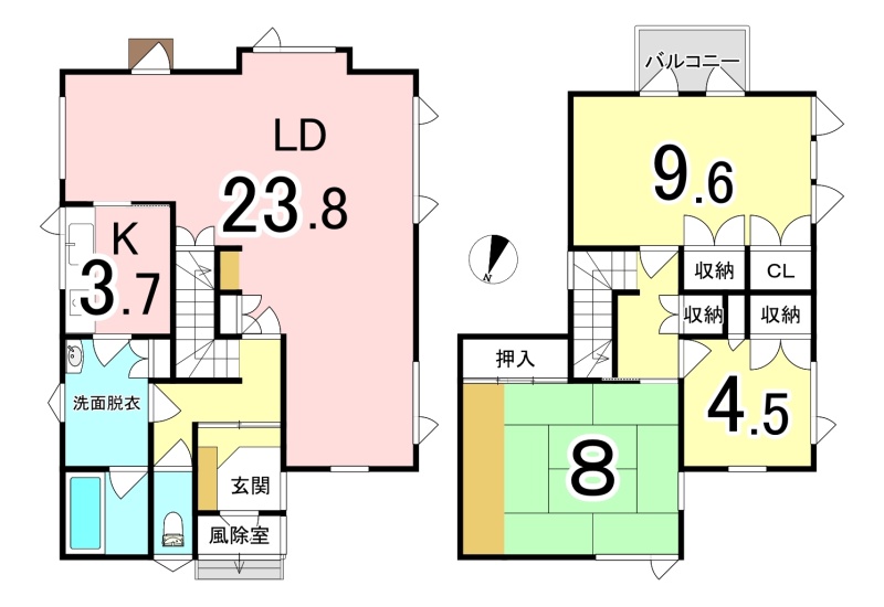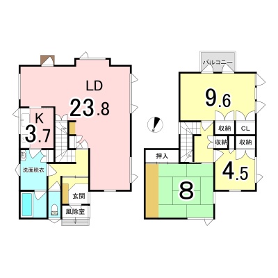 | 間取り | 3LDK1階:LD23.8帖 K3.7帖 / 2階:洋室9.6帖 洋室4.5帖 和室8帖 |