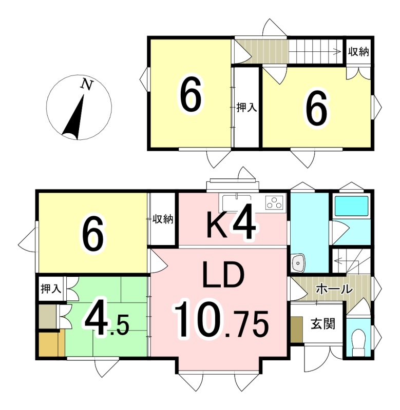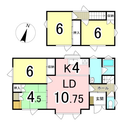 | 間取り | 4LDK1階:LD10.7帖 K4帖 洋室6帖 和室4.5帖 / 2階:洋室6帖 洋室6帖 |